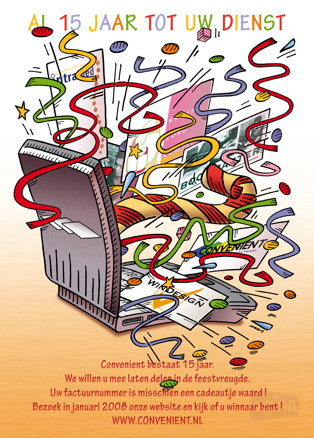 Bij het 15 jarig jubileum van Convenient werd deze vrolijke flyer met hun factuur mee gestuurd. Hun software werkt op basis van abonnementen en ze wilden dit klantmoment een feestelijk tintje meegeven.