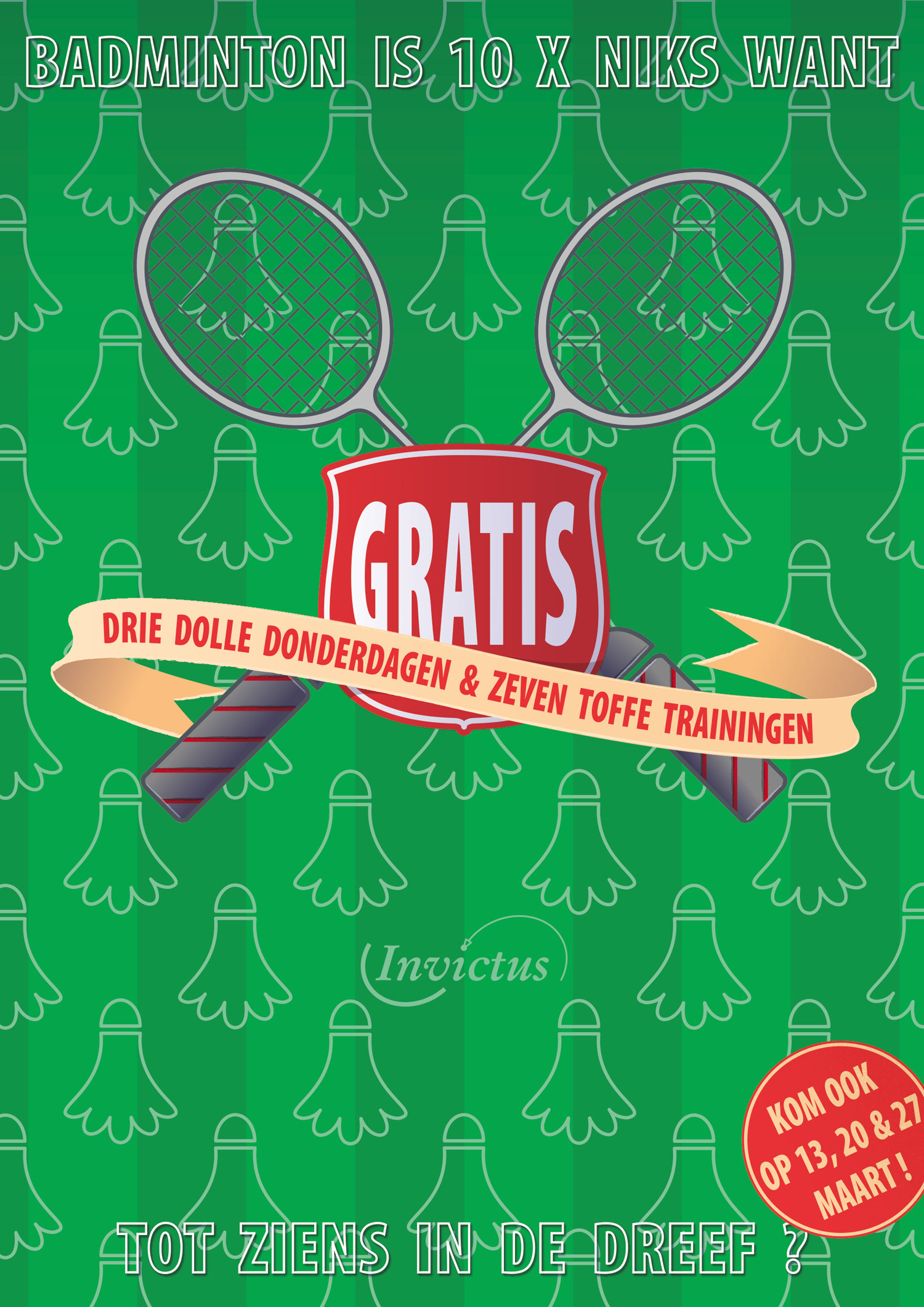 Verzin een leuke flyer waarmee we nieuwe leden voor badminton vereniging Invictus kunnen werven. Belangstellenden konden een maand lang proeflid worden. Kijk voor meer informatie op https://invictusbc.nl