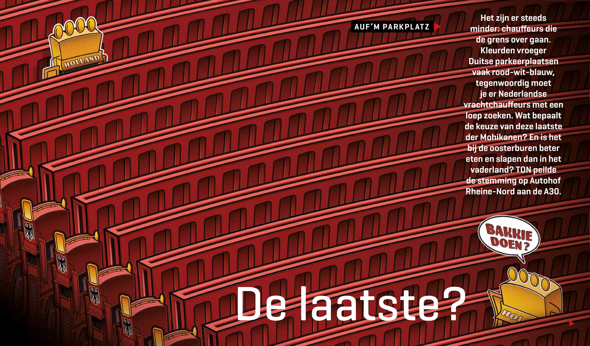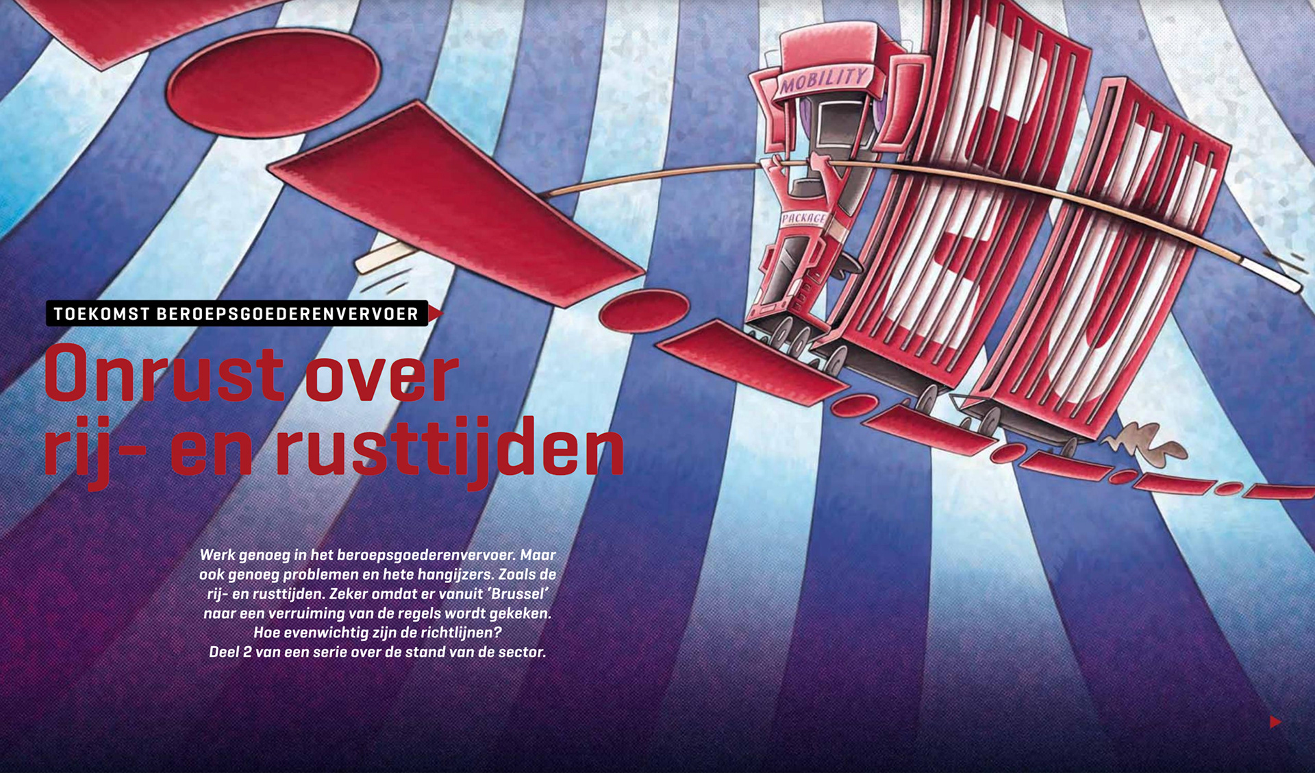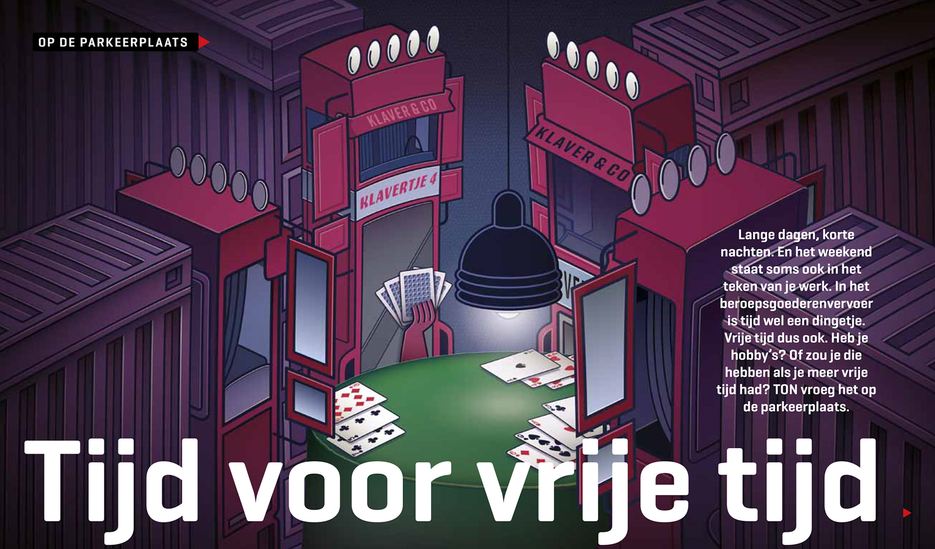 Al 10 jaar mag ik mijn tekentalent inzetten voor TON magazine. Het grootste magazine voor mensen die werken in transport & logistiek. Het wordt toegestuurd aan iedereen die binnen de CAO voor het wegvervoer valt. Dit betekent dat de redactie rekening moet houden met een brede doelgroep waar zowel de werknemers als de werkgevers binnen vallen. Binnen deze serie moest één grote aansprekende spread het onderwerp op een prikkelende wijze visualiseren om zo de lezer het verhaal in te trekken.