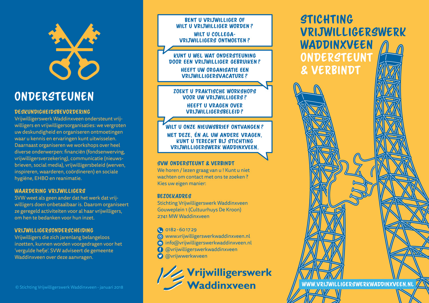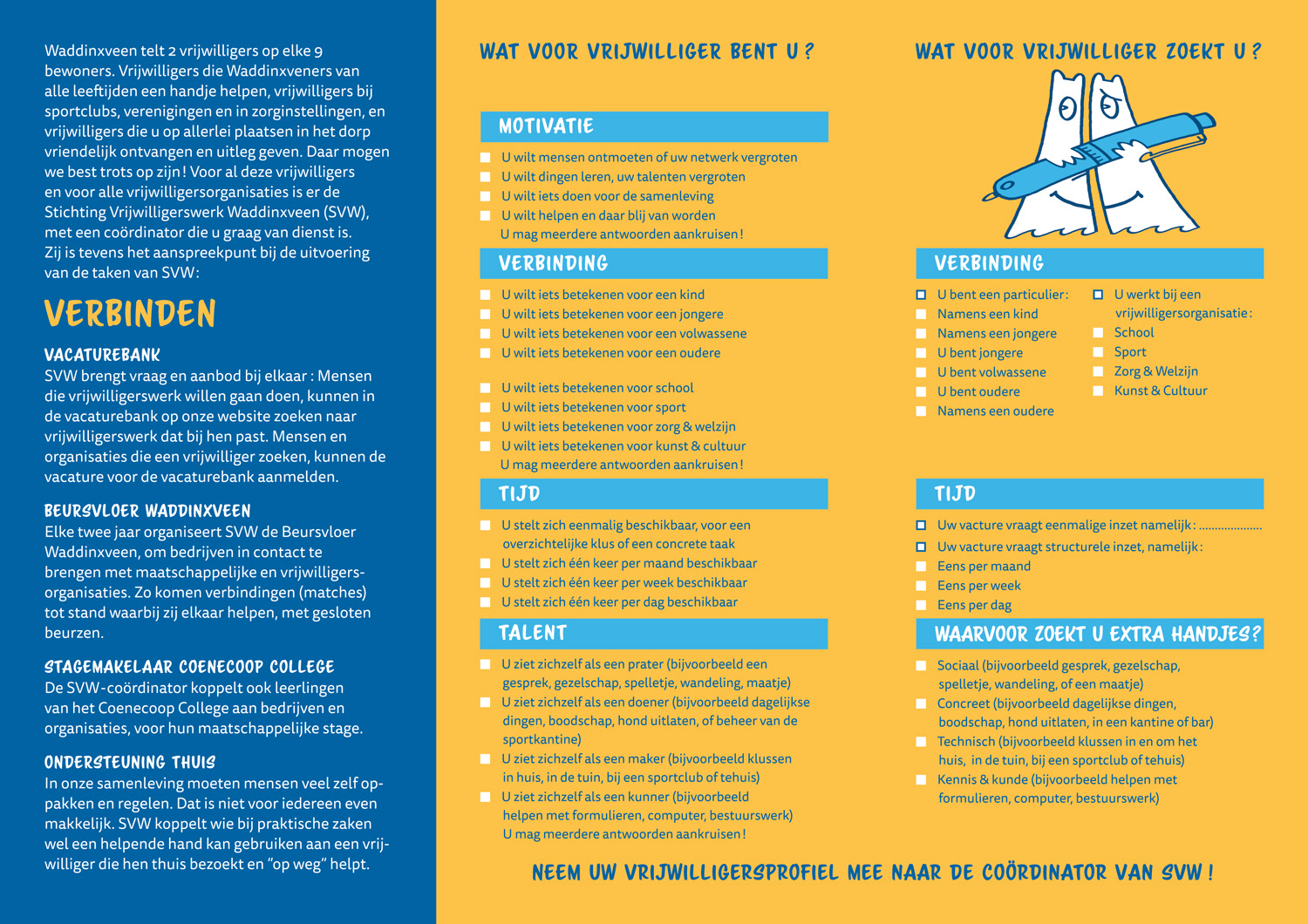 Stichting Vrijwilligerswerk Waddinxveen ondersteunt en verbindt de verenigingen en maatschappelijke organisaties uit Waddinxveen met hun vrijwilligers. Diverse zaken voor Stichting Vrijwilligerswerk Waddinxveen mogen ontwerpen.