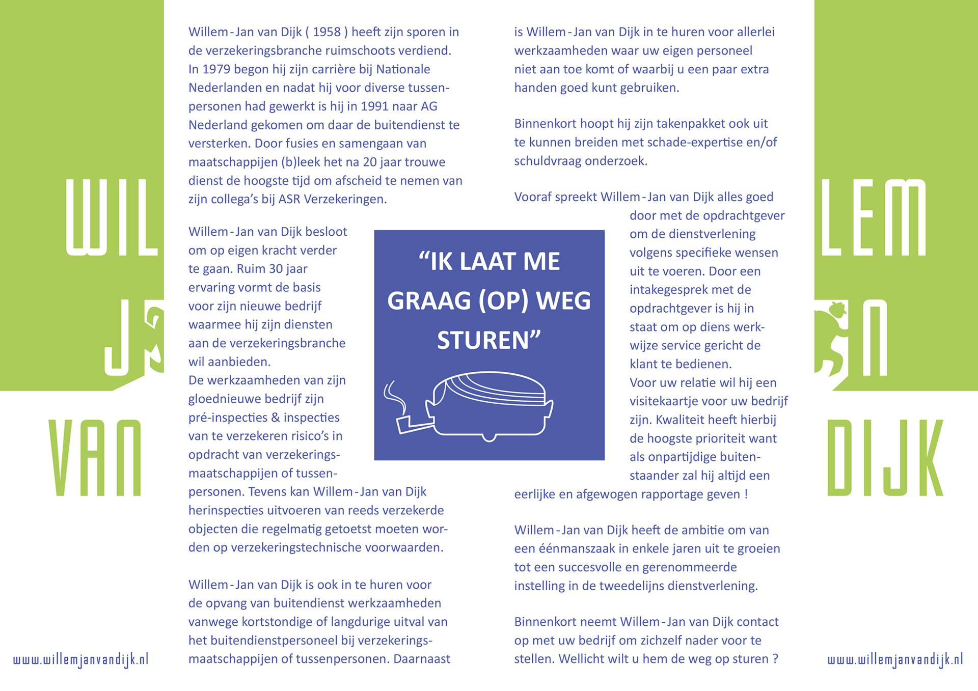 Na een lange carrière binnen de verzekeringsbranche startte Willem Jan van Dijk als zelfstandig adviseur. Voor hem heb ik een persoonlijke huisstijl & de bijpassende folder gemaakt waarmee hij op pad kon.